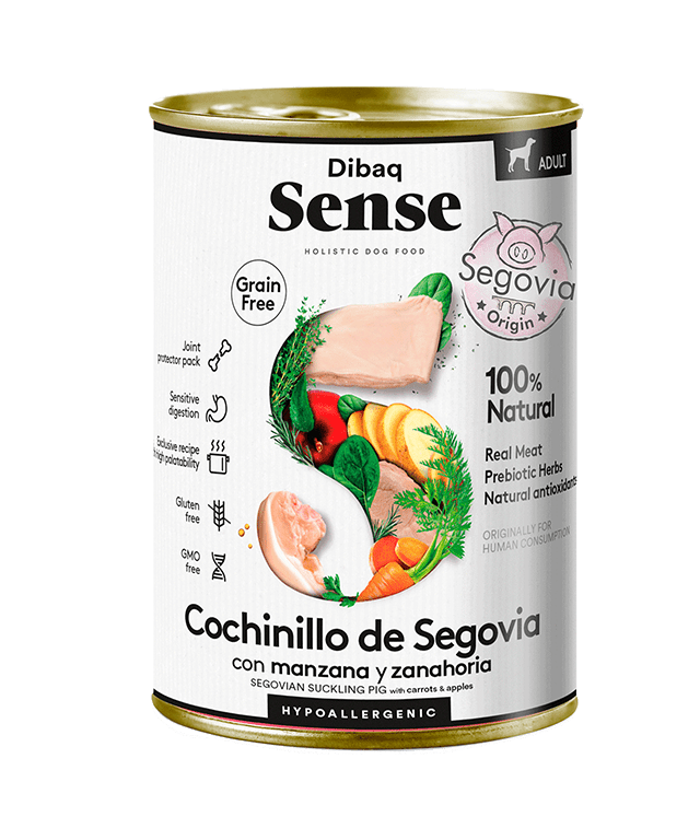 COMPOSICIÓN: Cochinillo segoviano fresco 76%*, patata, verduras y frutas frescas 2% (zanahoria* y manzana*), aceite de salmón 1% (fuente de ácidos grasos omega 3 y 6), pack protector articular 0,5% (condroitina sulfato, glucosamina clorhidrato y MSM), sustancias minerales, plantas aromáticas con propiedades antioxidantes naturales 0,02% (romero*, tomillo* y orégano*). * Ingredientes naturales.