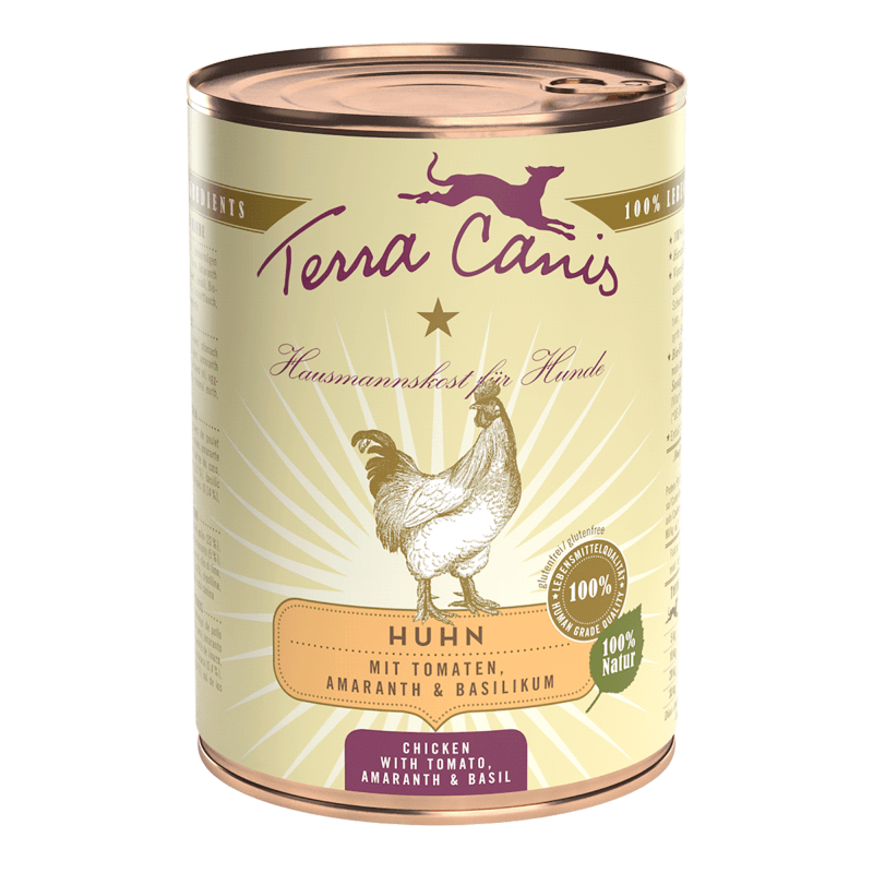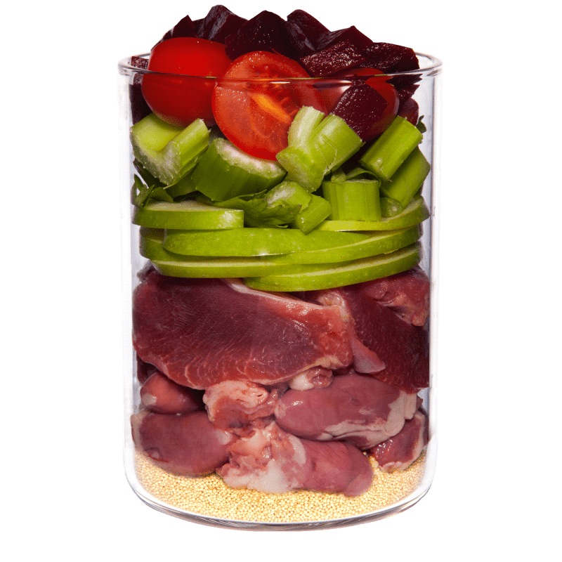 Corazón de pollo (24%), tomate (17%), estómago de pollo (14%), carne muscular de pollo (14%), hígado de pollo (7%), pera, amaranto (5%), mijo, remolacha, apio, harina de coco, aceite de linaza, polvo de cáscara de huevo, levadura de cerveza, albahaca (0,4%), cebollino, arcilla mineral, alga marina, sal de los Andes y escaramujo.