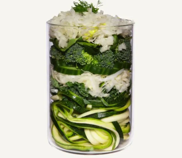 Calabacin (18 %), apio (18 %), flor de brócoli (18 %), pepino (9 %), espinaca (9 %), hinojo (9 %), manzana verde (9 %), col rizada, levadura de cerveza*, diente de león* (0,2 %), albahaca* (0,2 %), ajo de oso* (0,2 %), hoja de alcachofa* (0,1 %), ortiga* (0,1 %), eneldo* (0,1 %), perejil* (0,1 %), perifollo* (0,1 %), arcilla mineral*, alga marina* *ingrediente secco