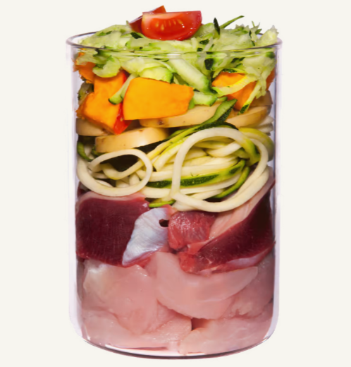 Corazon de pollo (30 %),estomago de pollo (22 %), patata, calabacin, calabza (8 %), tomate, pepino (5 %), carne muscular de pollo (4 %), higado de pollo (4 %), leche de capra (2 %), harina de coco, aceite de linaza, concha de ostra*, levadura de cerveza*, cola de caballo* (0,3%), espino blanco en polvo* (0,3%), glucosamina* (0,2%), semilla de hinojo, manzanilla* (0,2%), aceite de semilla de uva, ortiga* (0,2%), escaramujo*, arcilla mineral*, polen de flor*, alga marina*, minerales *seco