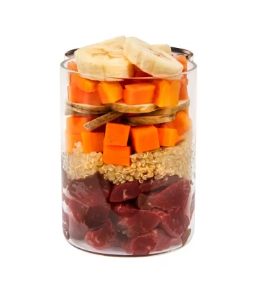 Carne : Quinoa : Verdura/fruta/hierbas : demás ingredientes : 58 % : 5 % : 35 %: 2 %