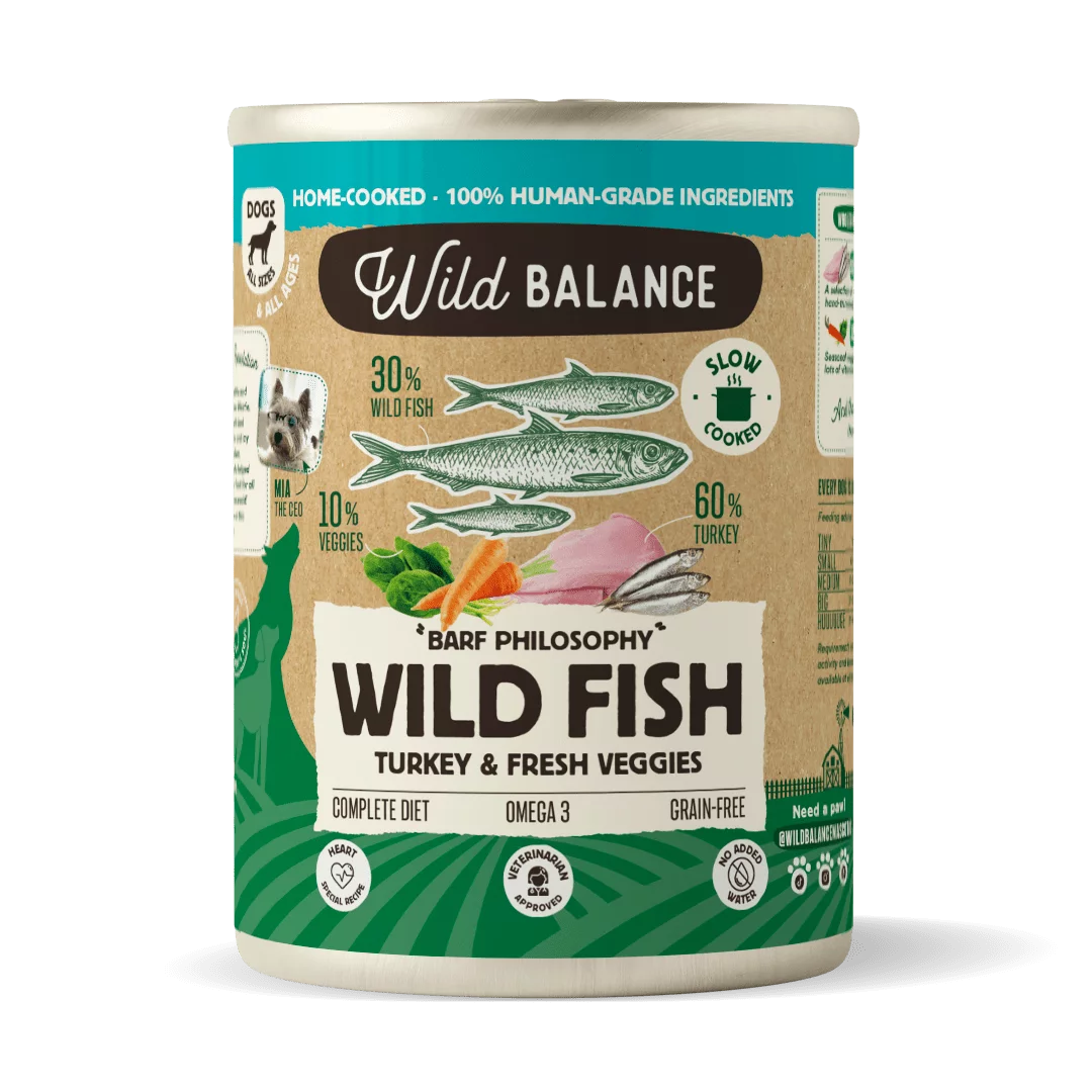 60% pavo fresco (45% pavo entero, 10% hígado de pavo, 5% corazón de pavo), 30% pescaditos salvajes (espadín), 7% zanahoria y 3% espinacas.