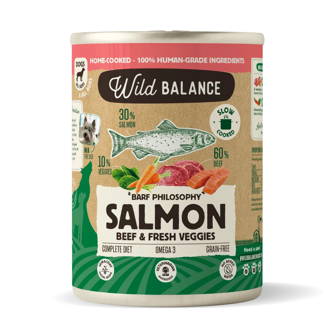 60% ternera fresca (30% carne picada de ternera, 10% hueso molido con tuétano de ternera, 10% corazón de ternera, 5% hígado de ternera, 5% riñón de ternera), 30% salmón fresco, 7% zanahoria y 3% espinacas.