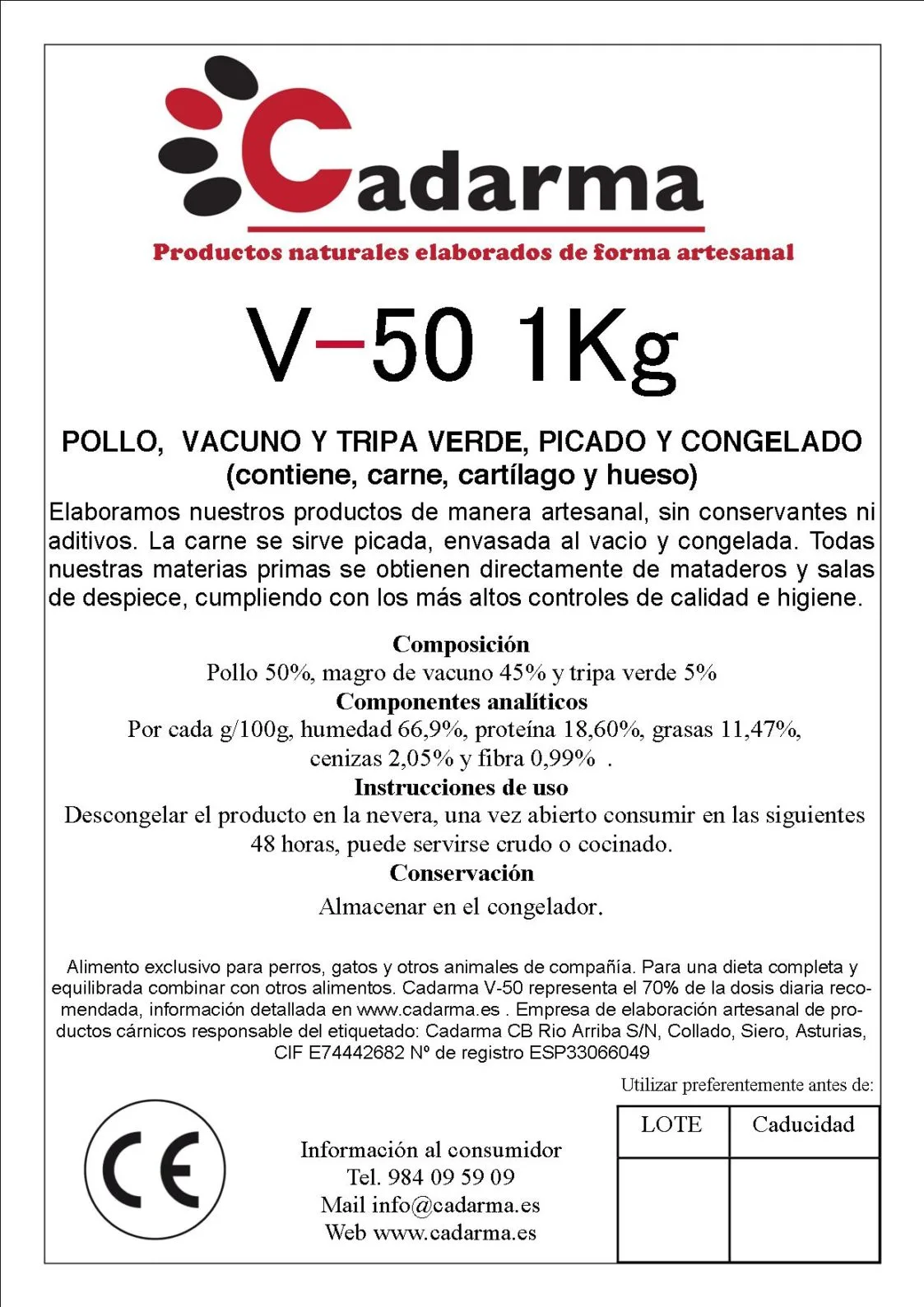 - Composición: Pollo 50%, Magro de vacuno 45% y tripa verde 5%