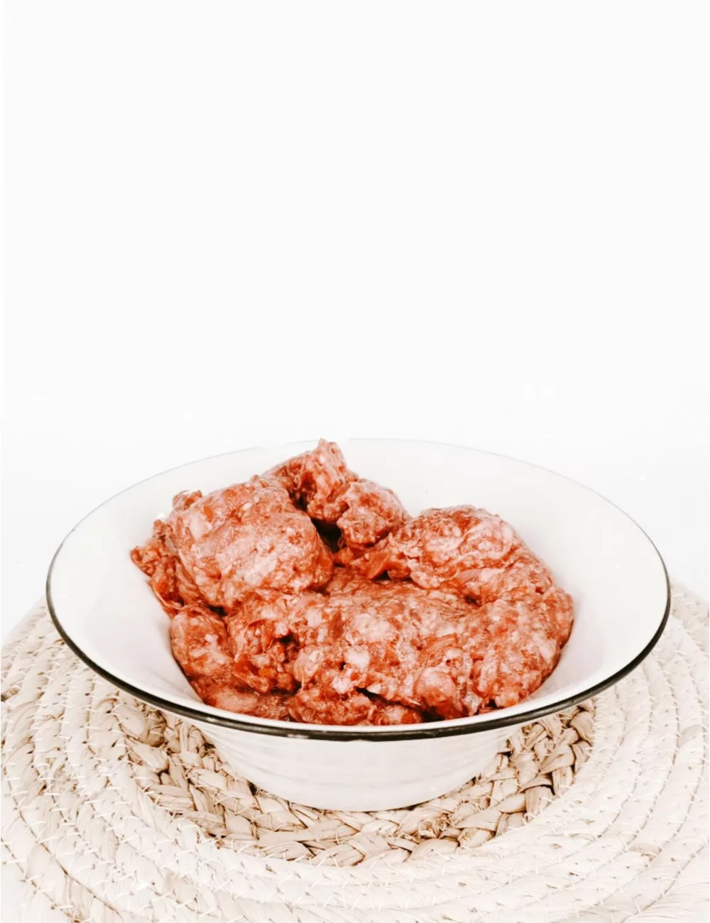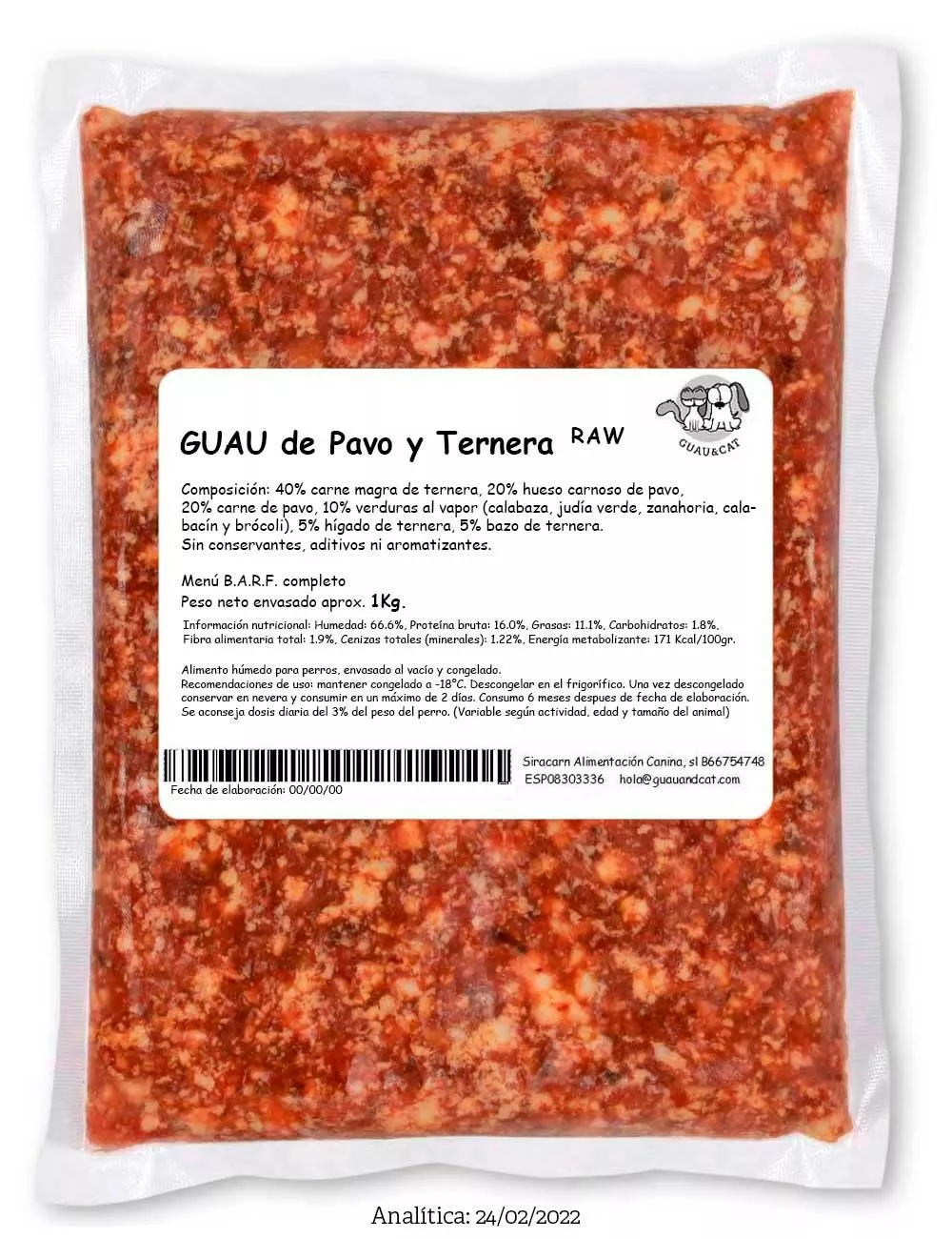 Ingredientes : 40% magro de ternera, 20% hueso carnoso de pavo 20% carne magra de pavo, 35% boquerón, 5% de hígado vacuno, 5% bazo vacuno, 10% de verduras al vapor (calabaza, zanahoria, judía verde, calabacín y bróccoli). Sin conservantes, aditivos ni colorantes
