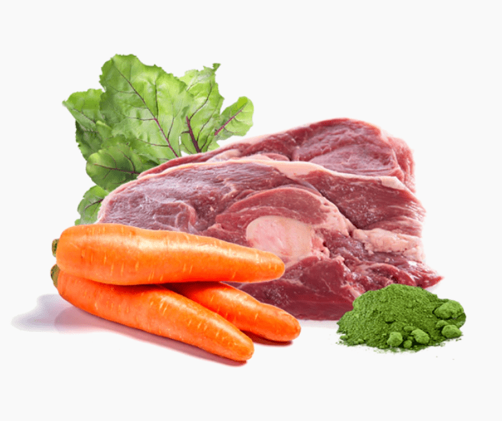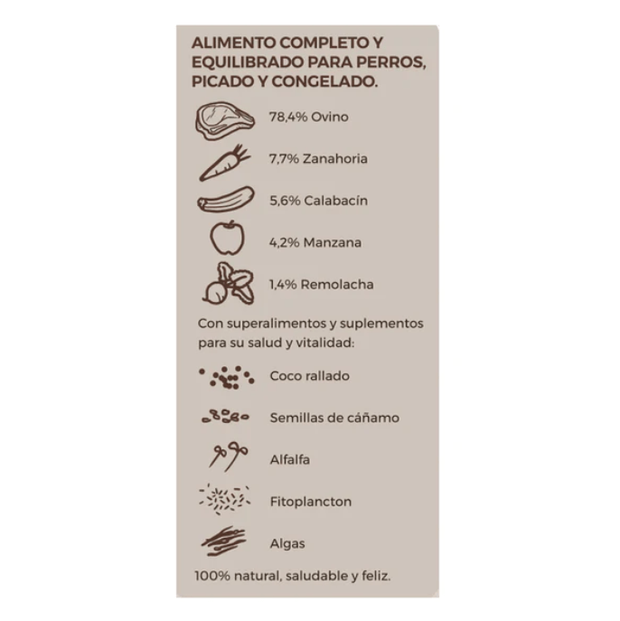Composición: Falda de cordero (43,3%), asadura de cordero (35%), zanahoria (7,7%), calabacín (5,6%), manzana (4,2%), remolacha (1,4%), semillas de cáñamo, coco, alfalfa, polvo de cáscara de huevo, aceite de hígado de bacalao, ascophyllum nodosum BIO (algas marinas), nannochloropsis (fitoplancton).