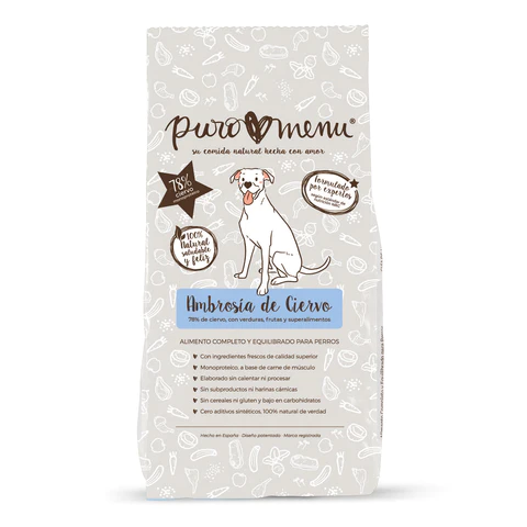 Composición: Carne de músculo de ciervo (78,2%), zanahoria (7,5%), semillas de girasol (5,5%), plátano sin piel (4,1%), aceite de coco BIO, yema de huevo, coco, semillas de cáñamo, polvo de cáscara de huevo BIO, aceite de hígado de bacalao, ascophyllum nodosum BIO (algas marinas), nannochloropsis (fitoplancton).