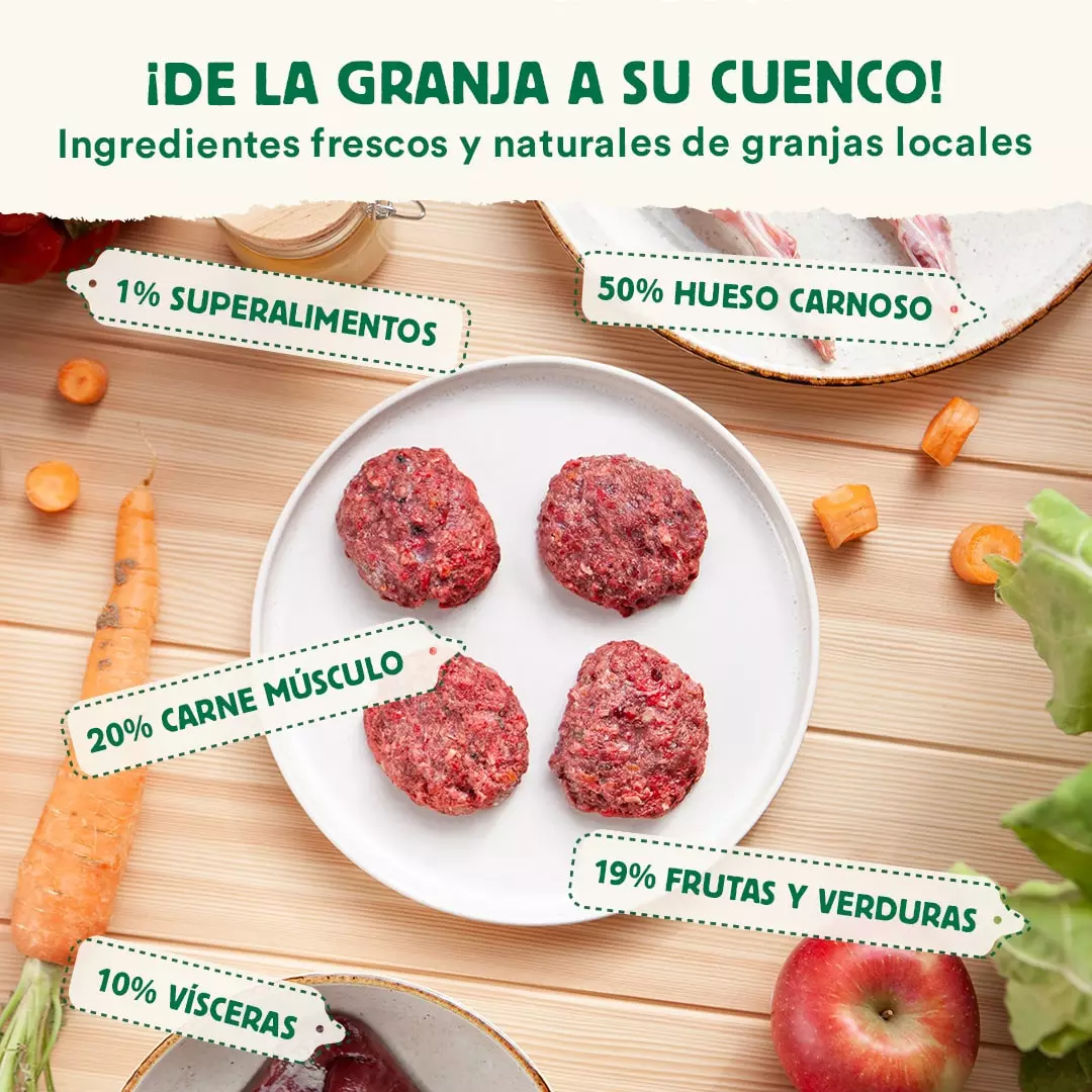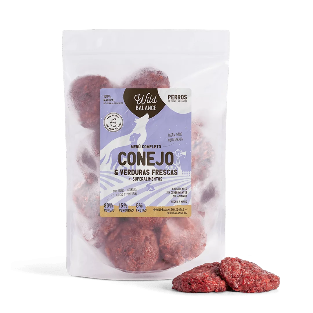 Especialmente formulado para perros. El menú incluye un 80% de conejo y un 20% de frutas, verduras y suplementos naturales.