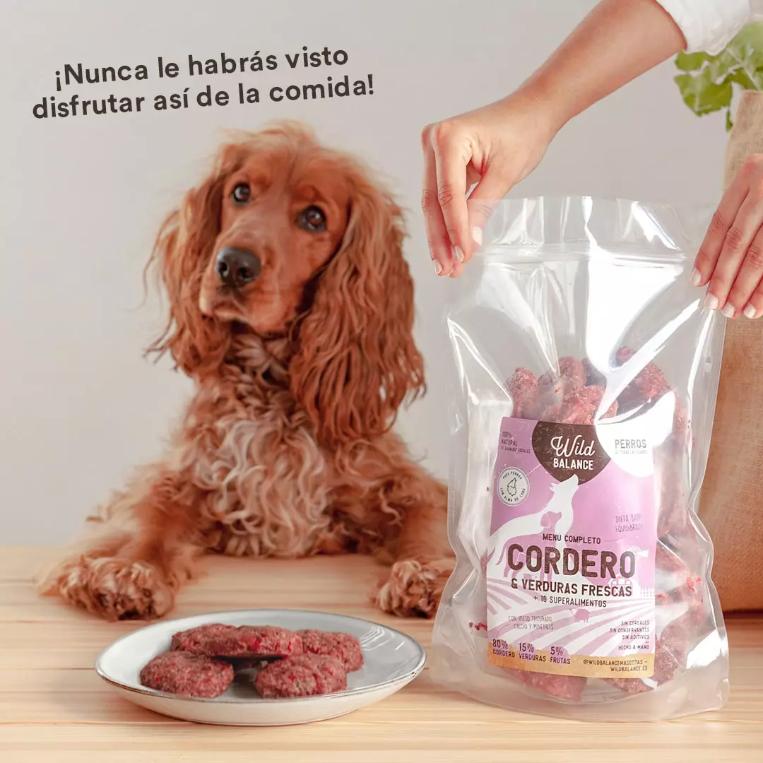 Especialmente formulado para perros. El menú incluye un 80% de cordero y un 20% de frutas, verduras y suplementos naturales.