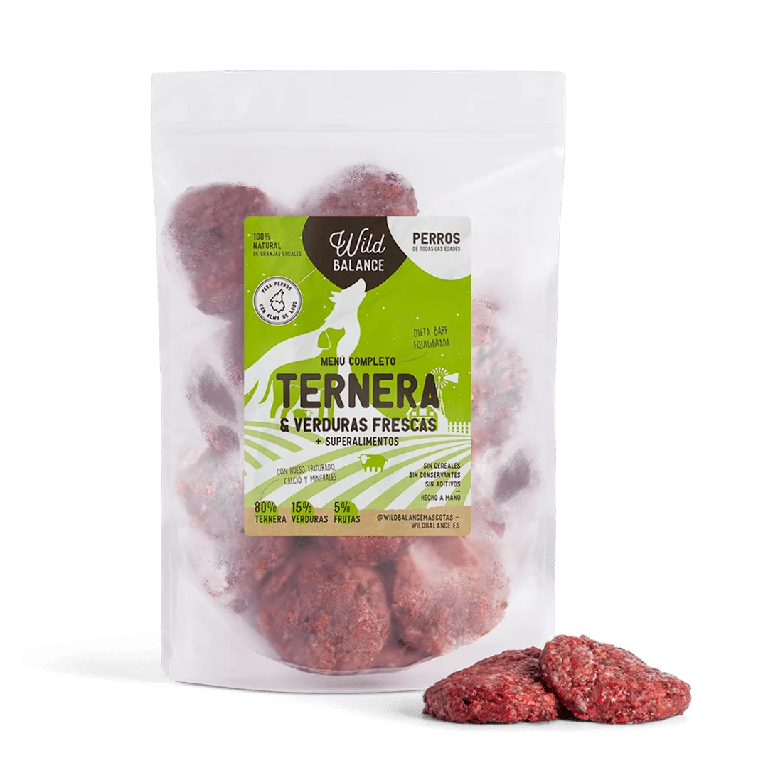 Menú completo BARF de ternera con verduras frescas para perros de todas las edades. Monoproteico. La ternera es una carne rica en proteínas, con alto contenido de vitamina B6 y hierro. El sabor del menú de ternera los vuelve locos.