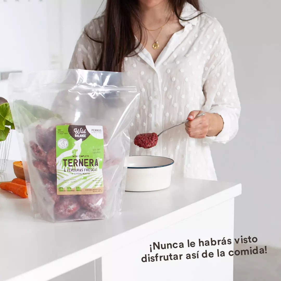 Especialmente formulado para perros. El menú incluye un 80% de ternera y un 20% de frutas, verduras y suplementos naturales.