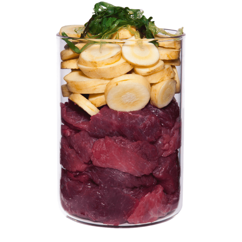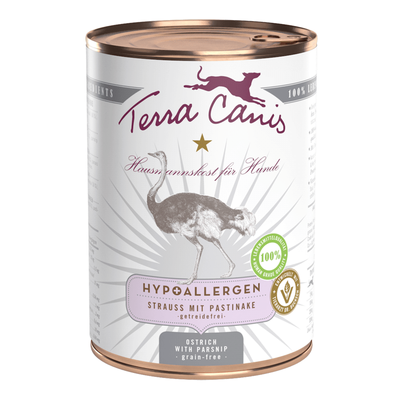 Carne muscular de avestruz (60%), chirivía (36%), aceite de linaza, aceite de colza y algas marinas.