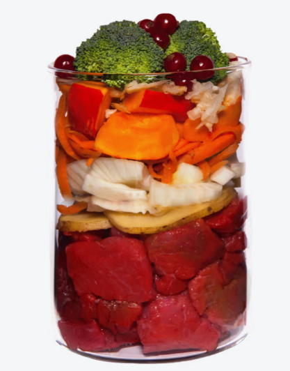 carne : verduras/frutas/hierbas : otras materias primas = 63% : 33% : 4%