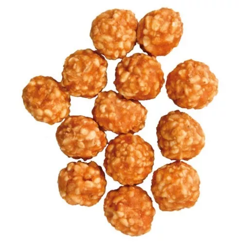 Están elaborados con ingredientes de alta calidad, como pollo y arroz, que son fuentes de proteínas y carbohidratos fácilmente digeribles para los perros. Estas bolitas son perfectas como premio durante el entrenamiento, como refrigerio entre comidas o simplemente como un gesto de cariño para tu mascota. Su tamaño pequeño las hace ideales para perros de todas las edades y razas, y su textura crujiente puede proporcionar una experiencia de masticación satisfactoria. Además, al estar hechas con ingredientes naturales, puedes estar seguro de que estás ofreciendo a tu perro un snack saludable y delicioso.