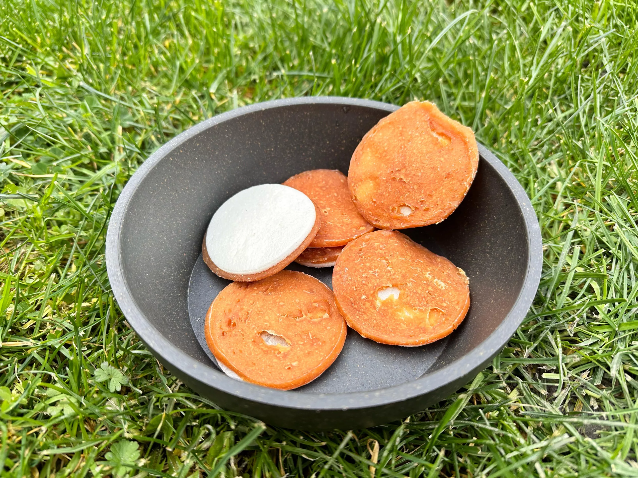 Snack con forma de disco de tamaño pequeño de piel de vaca recubierta de pollo. Es un snack perfecto para entretener a perros pequeños o como un aperitivo para perros medianos.