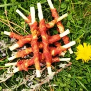 Composición: Carne de pollo (30%), harina de arroz, almidón de guisante, glicerina, almidón de tapioca, carbonato de calcio, fécula de batata, harina de trigo, aceites y grasas, tomate en polvo, coliflor en polvo caramelo romero.