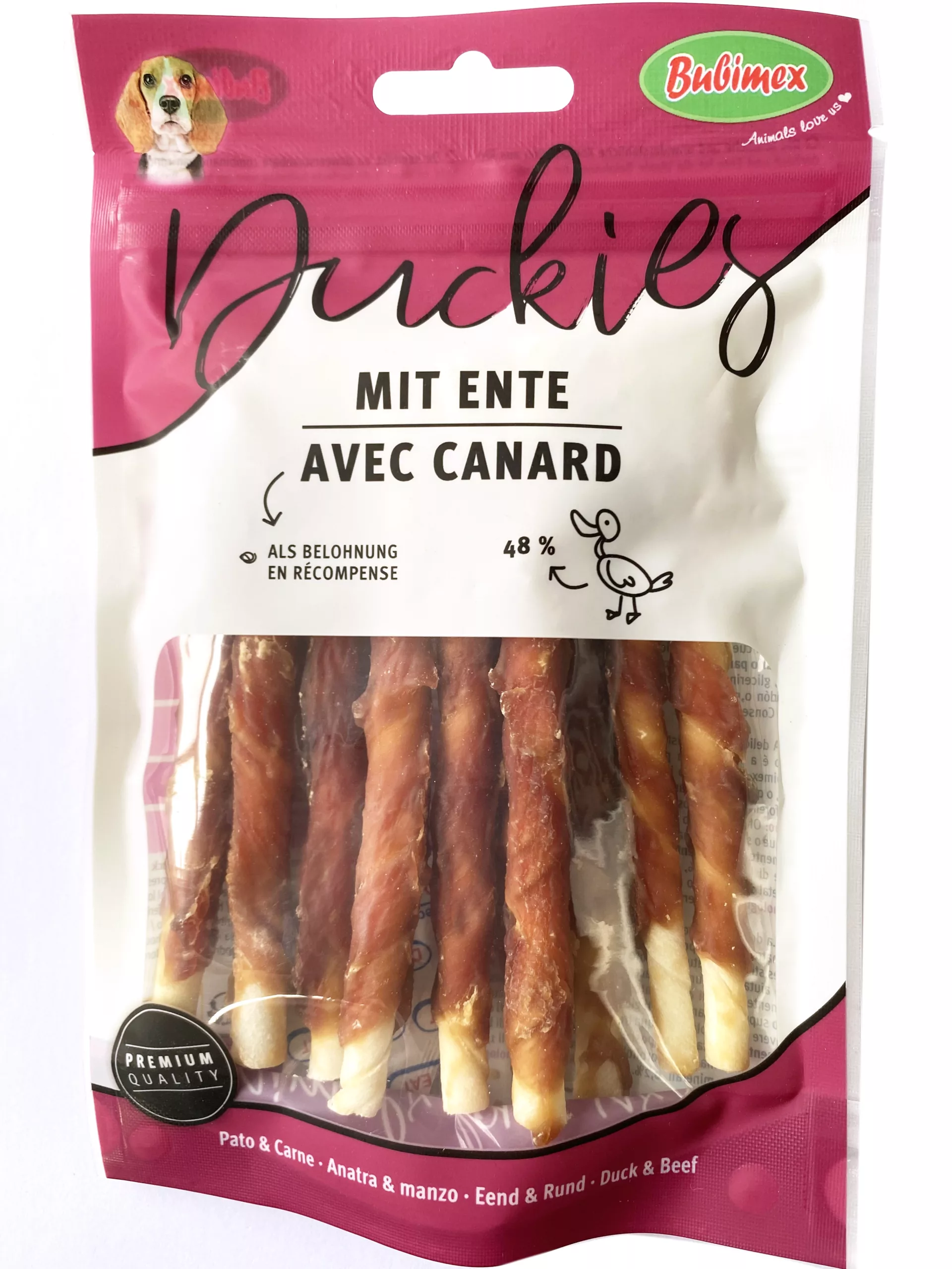 Composición: Pato 48%, Piel de Vacuno 45%, Glicerina 2,5%, Sorbitol 2,5%, Proteínas Vegetales 1,2%, Almidón 0,5%, Minerales 0,2%.