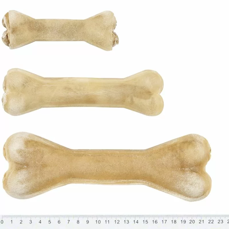 Huesos de piel de vacuno prensada con rico relleno de nervio de buey. Mantienen los dientes limpios y las encías sanas y son bajos en grasas