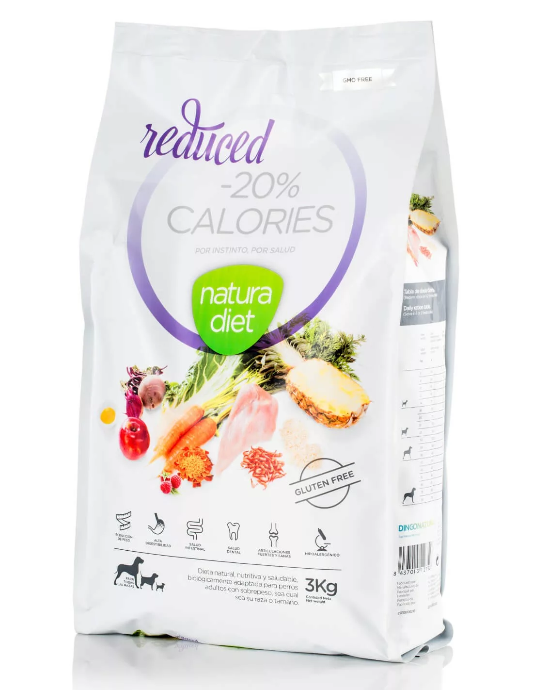 Pavo deshidratado (35%), arroz integral (20%), manzana deshidratada (7%), arroz entero, aceite de pato (3%), huevo entero deshidratado, aceite de salmón, fibras vegetales, zanahoria deshidratada, piña deshidratada, hojas de frambuesa roja, garcinia cambogia, acelga deshidratada, remolacha roja deshidratada, alga spirulina, extracto de yuca, PROHEALTH (1%): extracto de mejillón de labios verdes, extracto de krill, zanahoria deshidratada, tomate deshidratado, rosa de la India deshidratada, alfalfa deshidratada, algas deshidratadas, extracto de semilla de diente de león, extracto de cítricos, aceite de borraja, brócoli deshidratado, extracto de semilla de té verde, manzanilla deshidratada, extracto de semilla de orégano, extracto de semilla de cardo mariano, arándanos, L-carnitina, taurina, FOS, MOS, probióticos, PROSAFE COMPLEX (0.03%): romero, clavo, pomelo y extracto de uva deshidratados, aceites vegetales ricos en alfa tocoferoles.