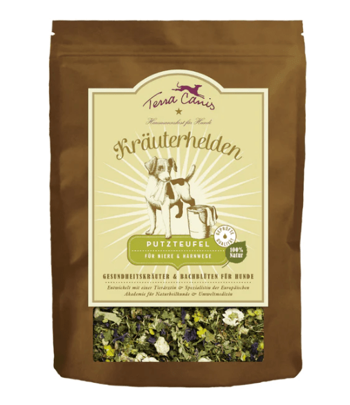 Los riñones son el órgano filtrante central que regula la presión arterial y la excreción de sustancias urinarias. Cuando un perro tiene un problema renal debemos minimizar el trabajo de estos órganos, por eso debemos bajar un poquito la cantidad de proteínas en la dieta de nuestros perros pero sobre todo aumentar la calidad de las mismas. También se debe controlar el aporte de sodio, fósforo y otros minerales. Las hierbas renales de Terra Canis ayudan a mejorar la actividad renal, incluyen ortiga, abedul, vara de oro y rebrote usado tradicionalmente en la medicina natural. Este suplemento además incluye flores de bach, por lo que es un producto único en el mercado, ideal para perros con problemas renales, o para prevenirlos si tenemos que dar medicación fuerte.