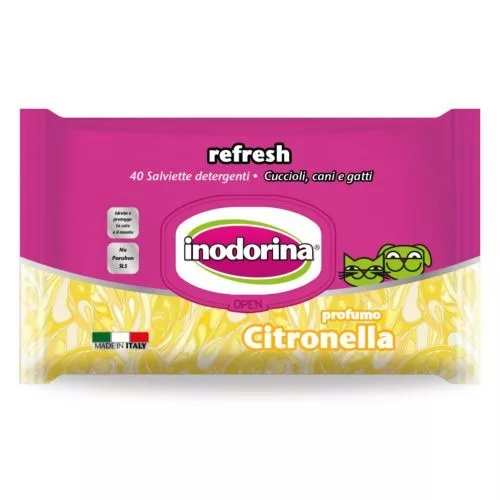 Inodorina Refresh son perfectas para cualquier momento. Las puedes tener en casa o llevar directamente en el bolso para usarlas siempre que lo necesites. Puedes usarlas para desinfectar y limpiar a tu mascota después de un paseo o un viaje. Incluso puedes usarlas en invierno, cuando hace demasiado frío para los baños, para proporcionar a tu perro o gato un agradable aroma a citronella.