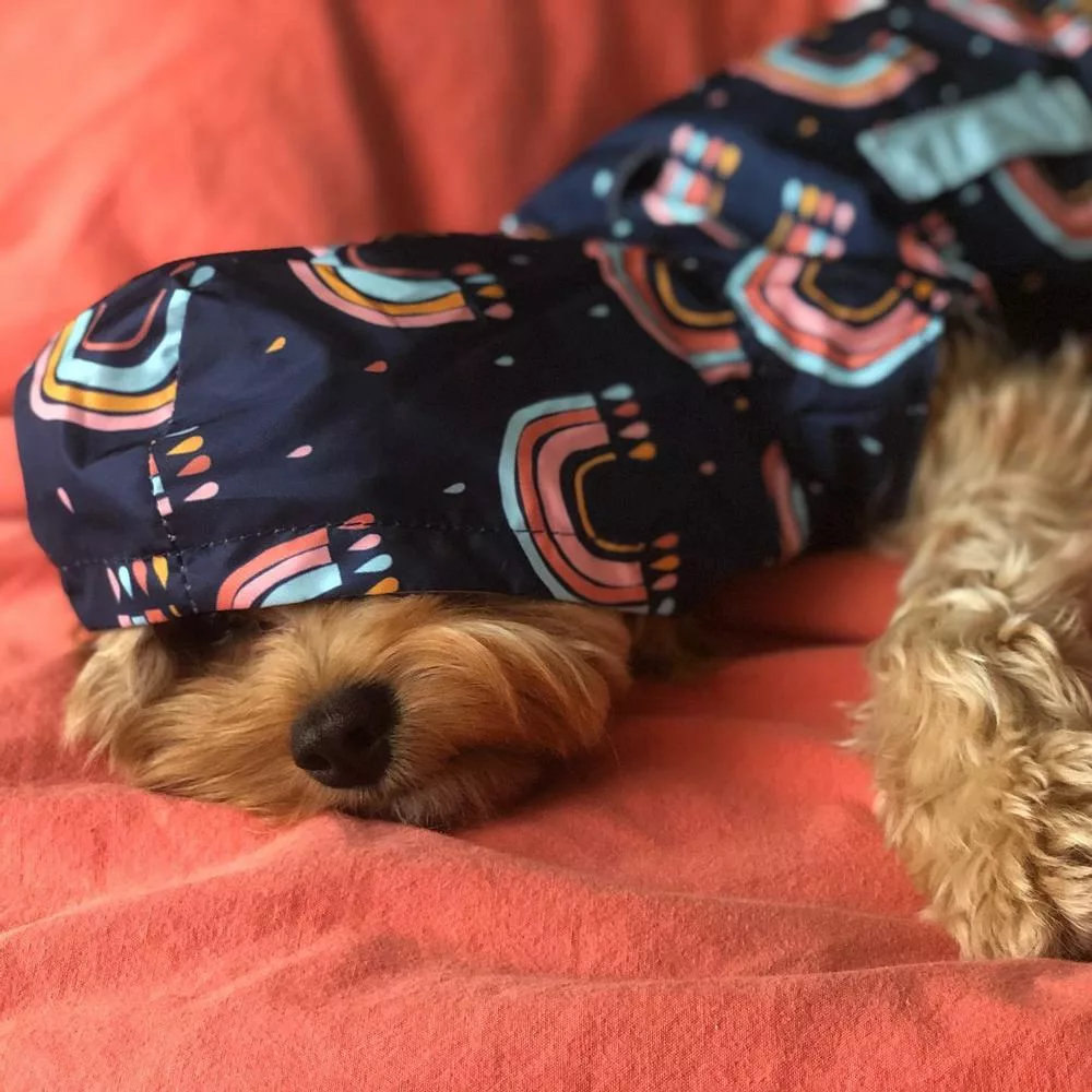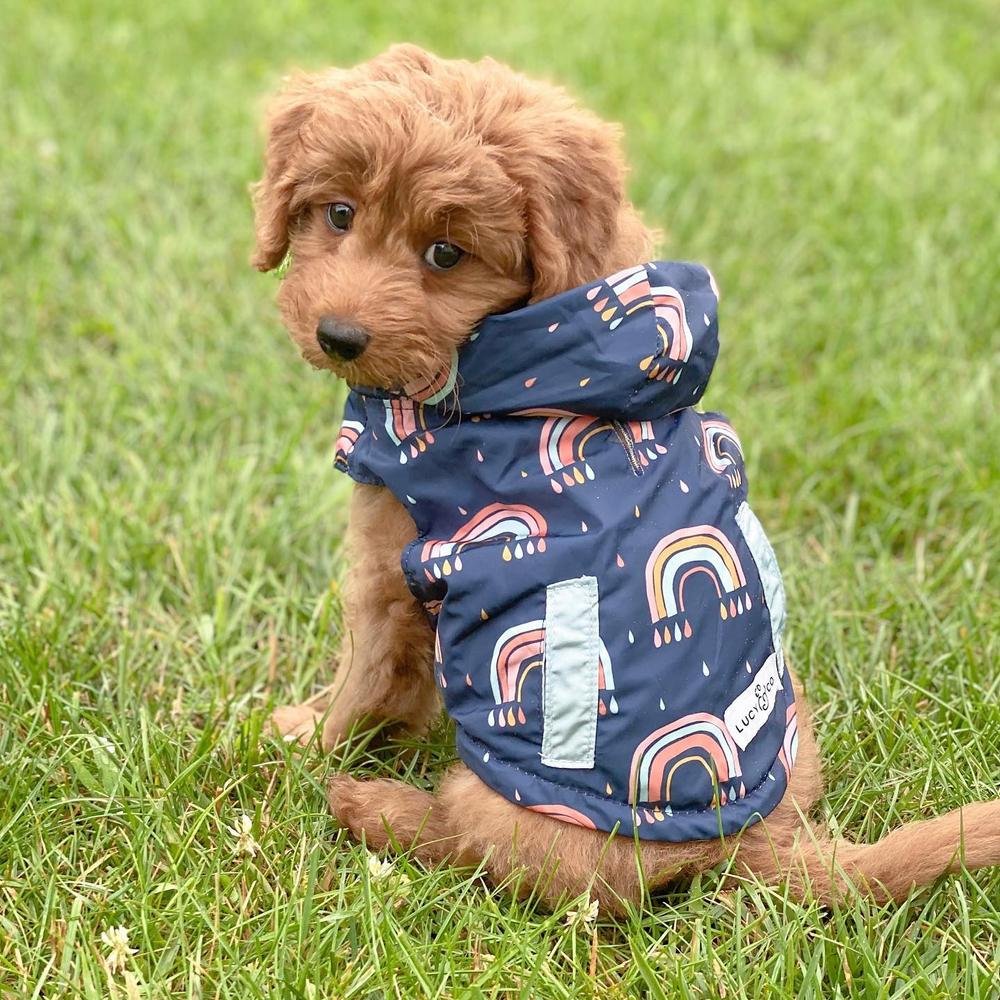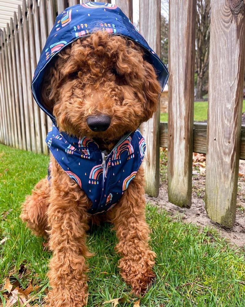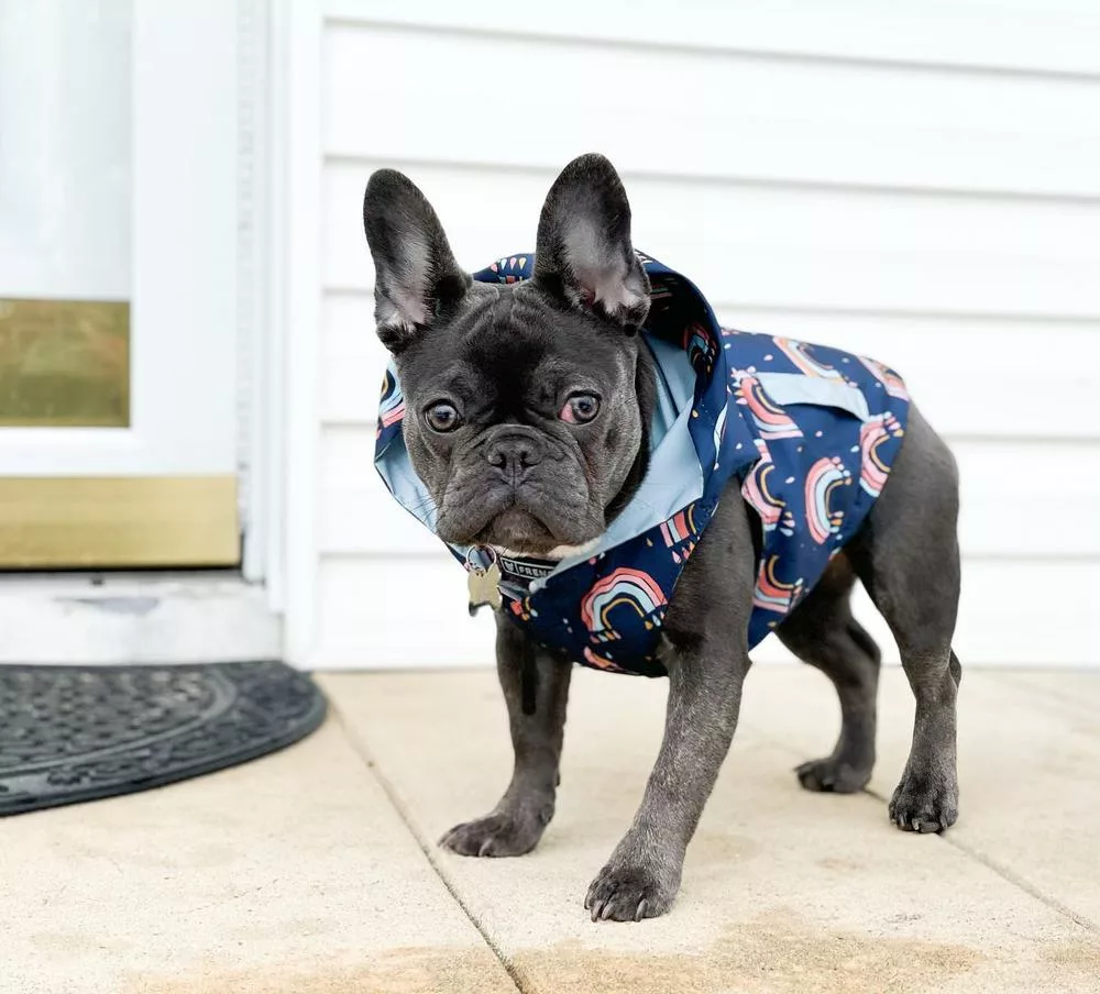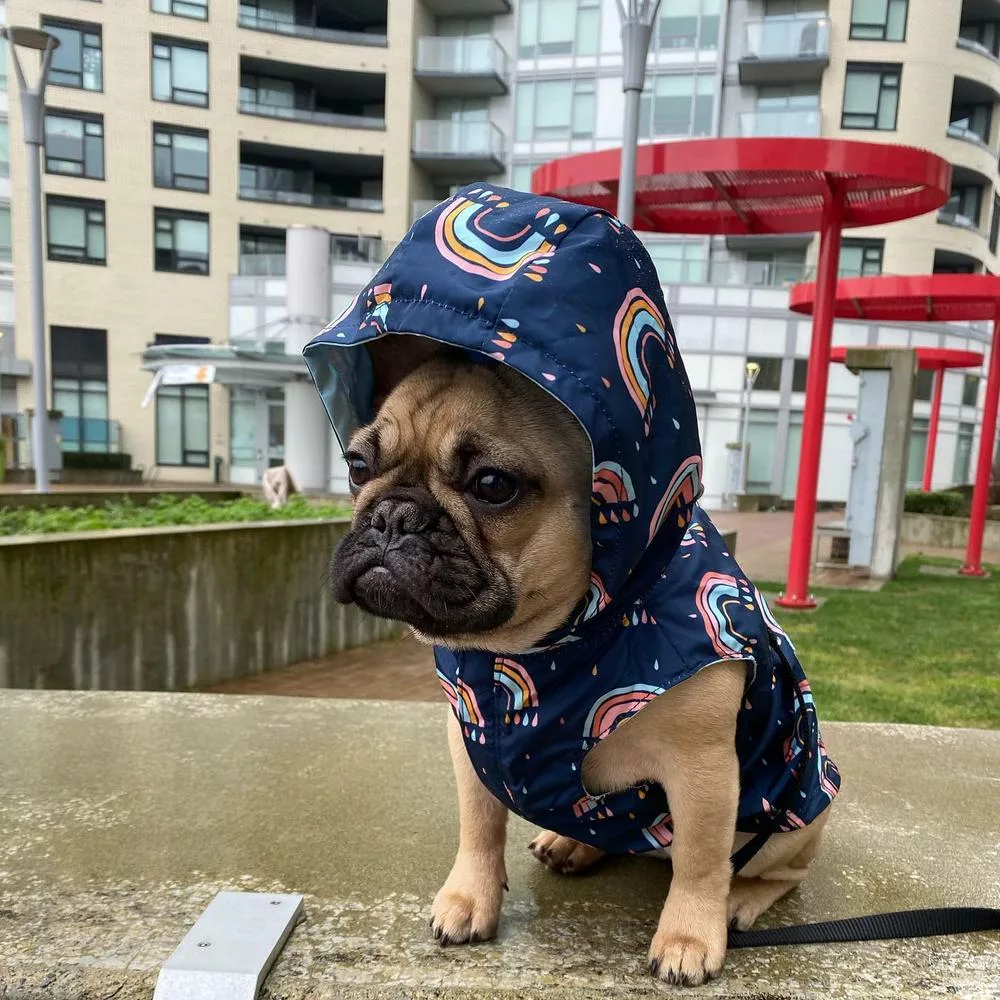 - Reversible: Por un lado es un chubasquero Azul clásico y por el otro es un divertido impermeable de arcoíris y gotas
