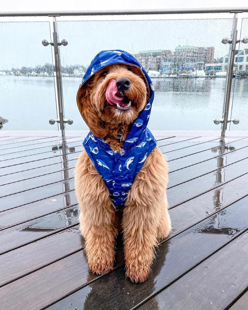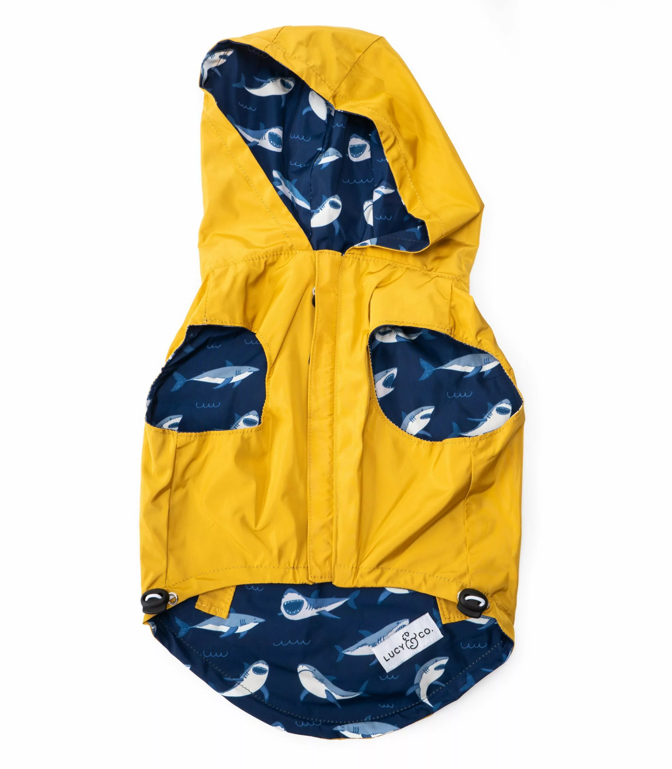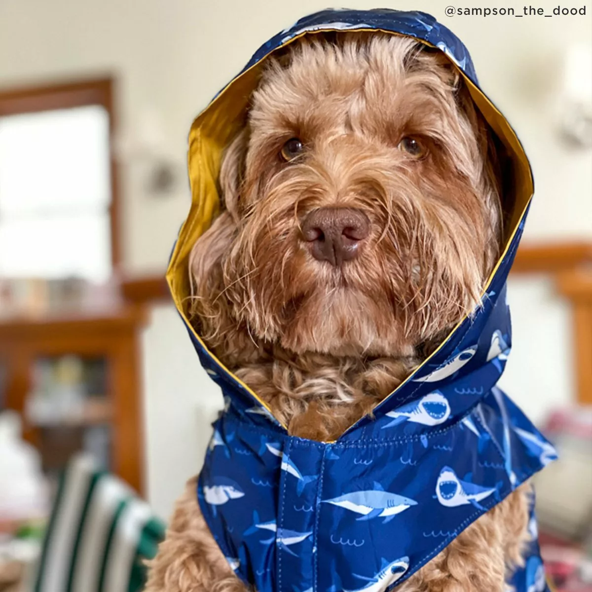 - Reversible: Por un lado es un chubasquero amarillo clásico y por el otro es un divertido impermeable de tiburones azules.