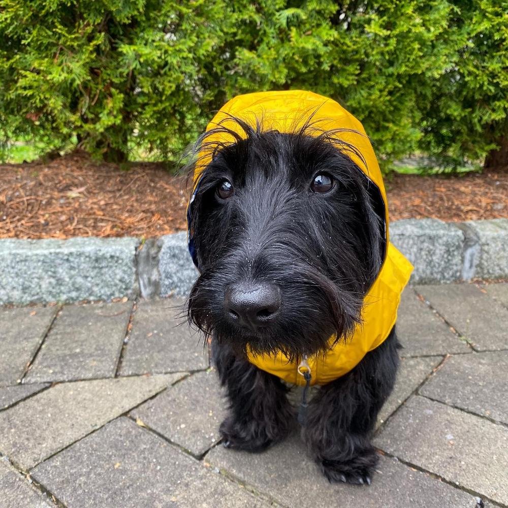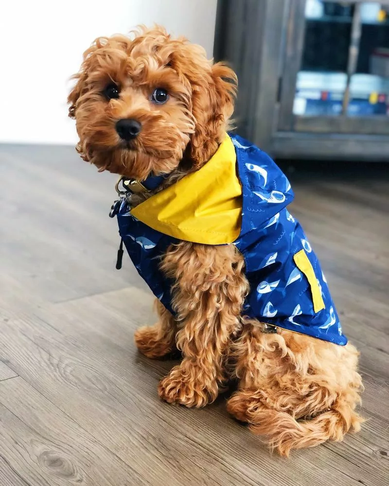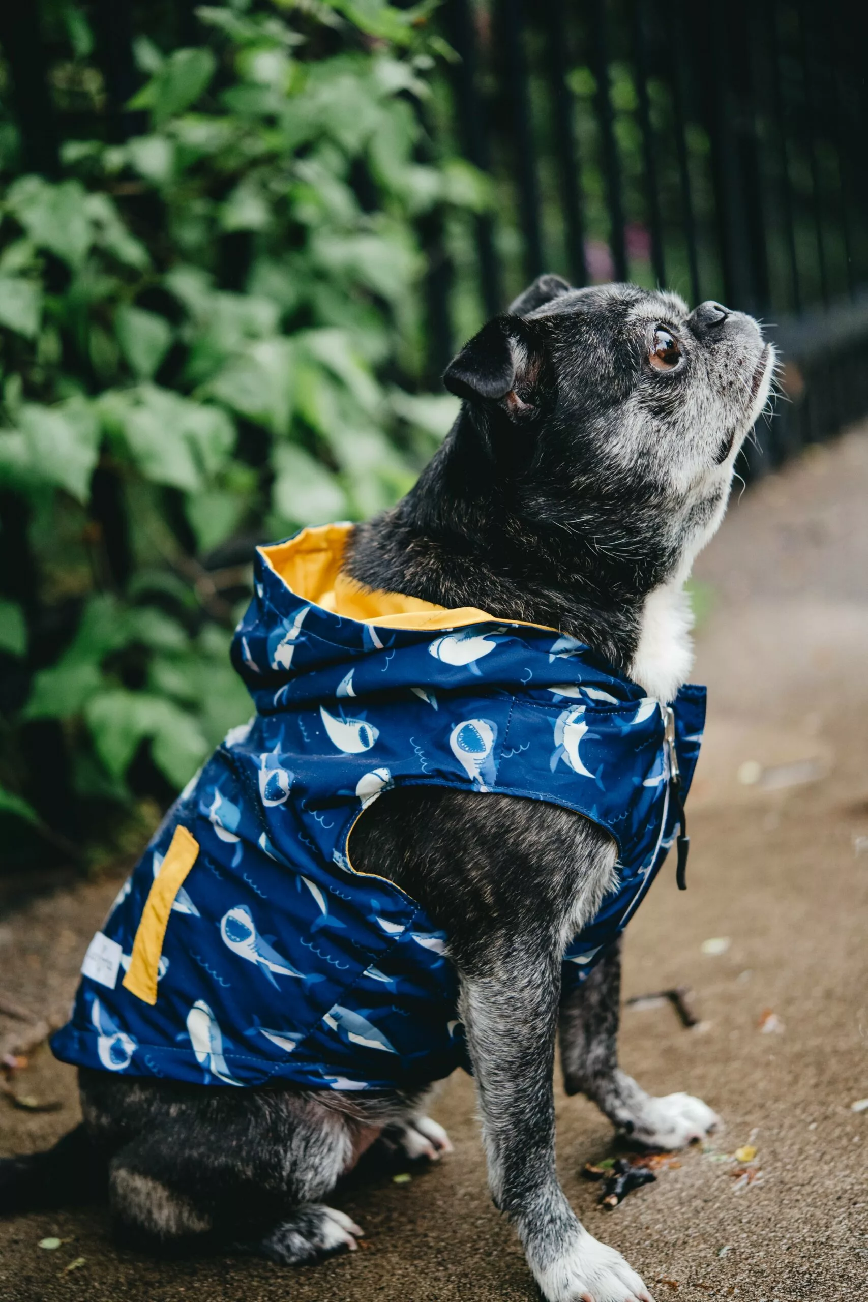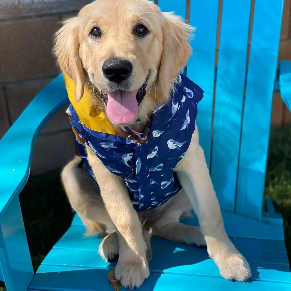 - Reversible: Por un lado es un chubasquero amarillo clásico y por el otro es un divertido impermeable de tiburones azules.