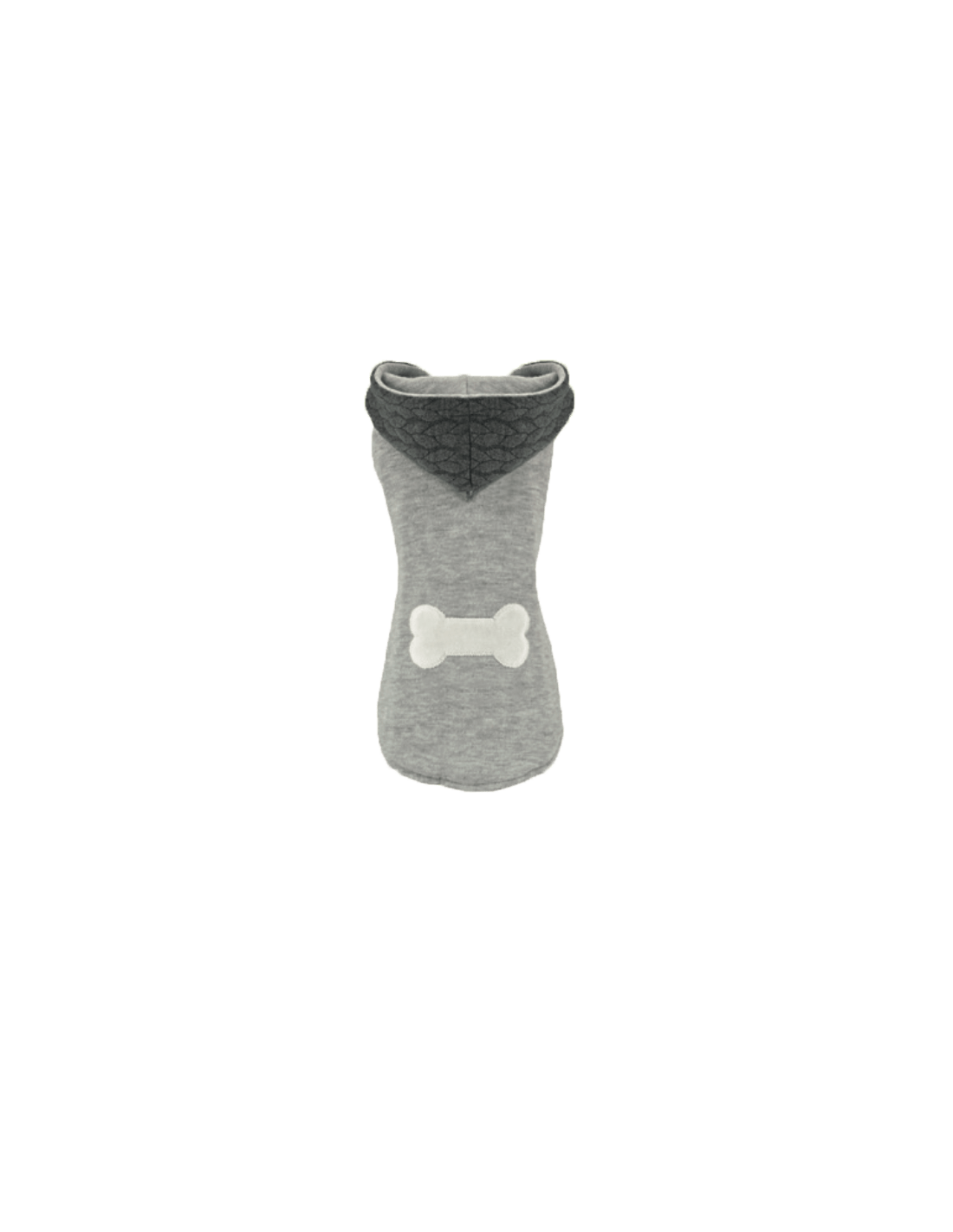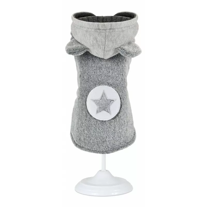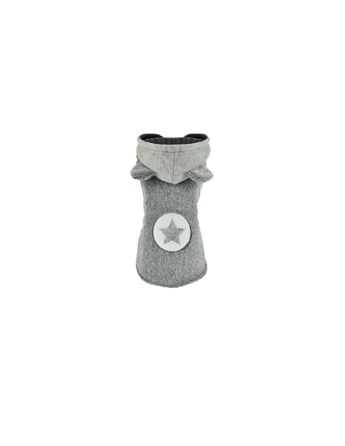 Es una sudadera bastante gruesa que abriga mucho. Lleva capucha y en la espalda dispone de un ojal para sacar la correa.